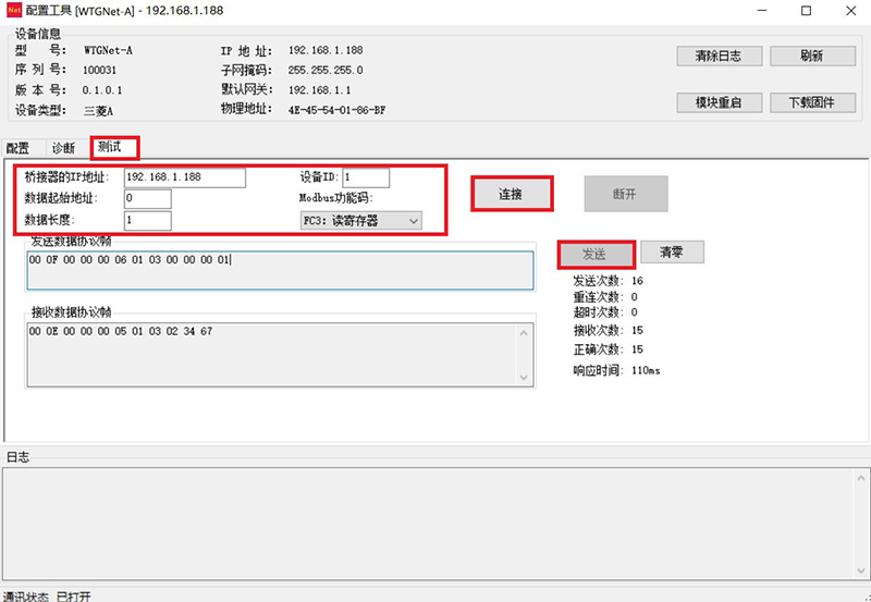 选择【测试】选项页,打开测试界面,设置完通讯参数,依次点击【连接】按钮----【发送】按钮,可以测试三菱A数据采集网关和plc的modbus通讯;