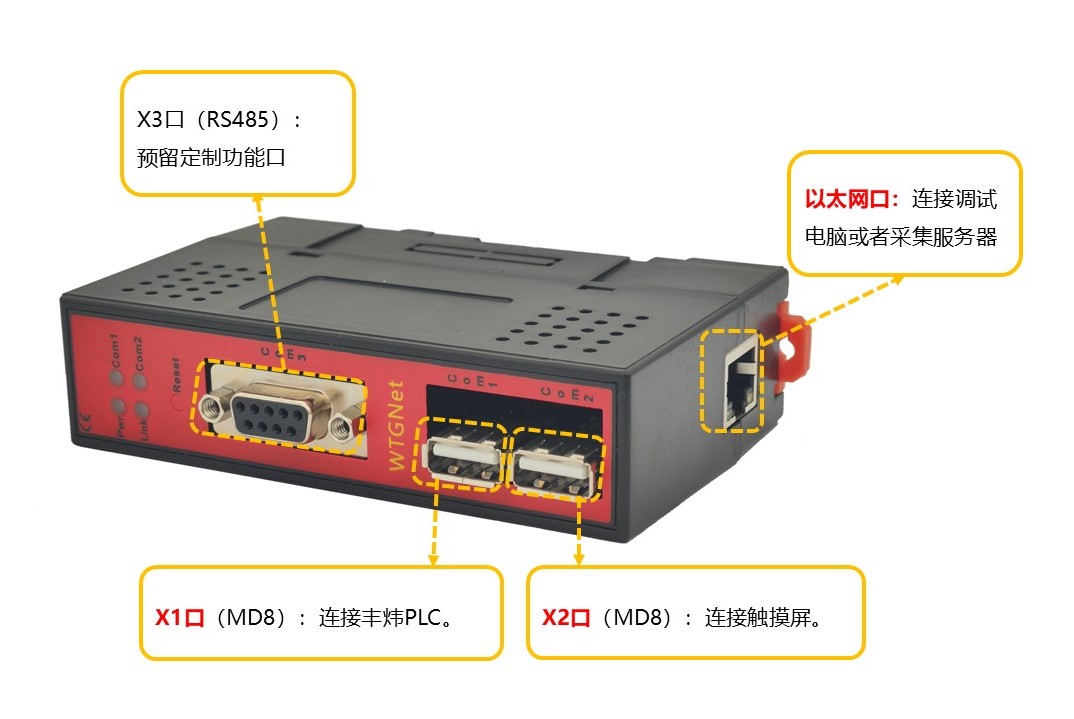 产品介绍:丰炜协议转换网关,WTGNet-VGR,主要应用于丰炜VB/VH系列PLC的数据采集,支持USB(RS232)通讯口直接插入,支持丰炜Ladder Master编程口协议通讯;采用三通设计,即插即用(自动获取电源,无需额外供电,也可外供24VDC)。无需修改PLC任何参数,编程软件或采集软件通过网关的以太网对PLC数据监控和采集,触摸屏可以通过扩展的USB(RS232)口与PLC进行通讯。